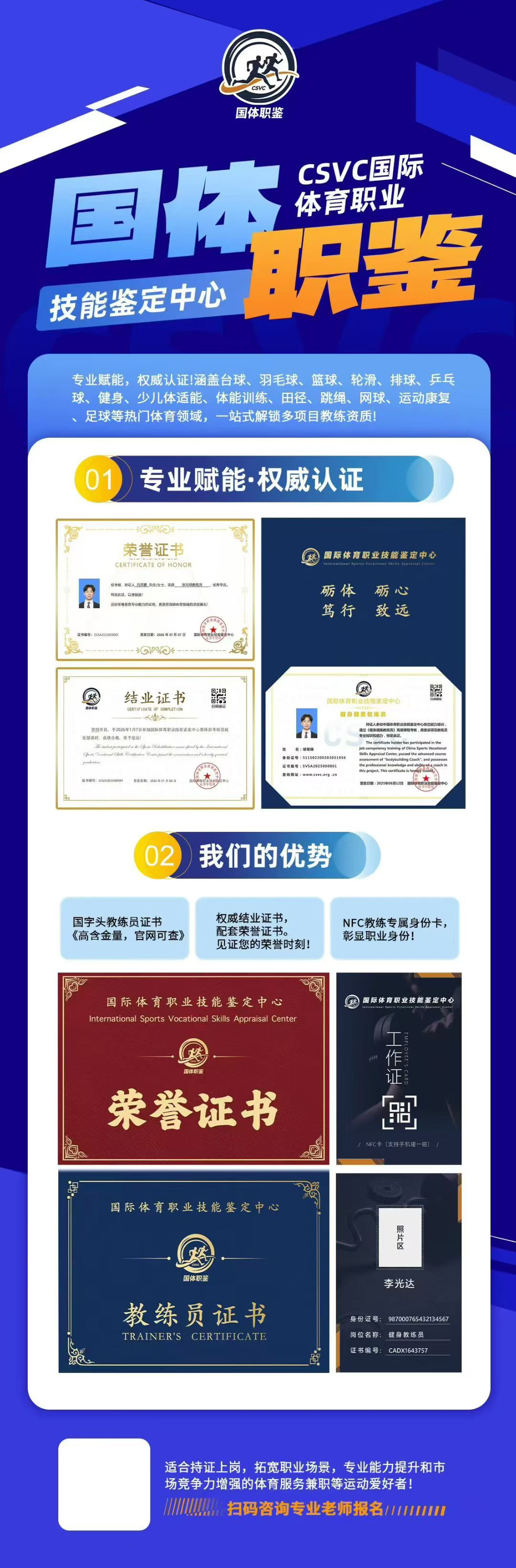 CSVC国体职鉴技能鉴定中心 教练员报名流程 《涵盖各项教练员权威认证》❗ 台球、羽毛球、篮球、轮滑、排球、乒乓球、 健身、体适能、体能训练、田径、跳绳、网球、棒球、运动康复、运动营养、足球、中考体育、马术、射击、射箭、综合格斗、自由搏击、武术、跆拳道、摔跤、柔道、拳击、泰拳、 等等热门领域项目,一站式解锁更多种类教练员资质❗