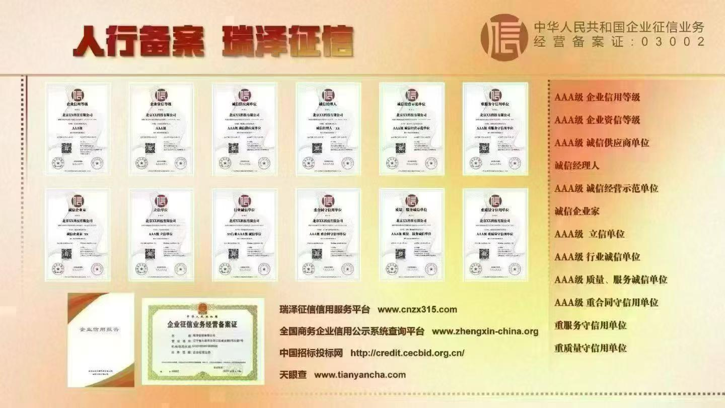 AAA级信用等级证书一套1、AAA企业信用等级证书2、AAA企业资信等级证书3、AAA重合同守信用证书 4、AAA质量服务诚信企业证书5、AAA诚信经营示范单位证书 6、诚信企业家证书 7、诚信经理人证书8、行业诚信单位证书9、立信单位证书10、AAA诚信供应商证书11、AAA信用牌匾 12、信用报告