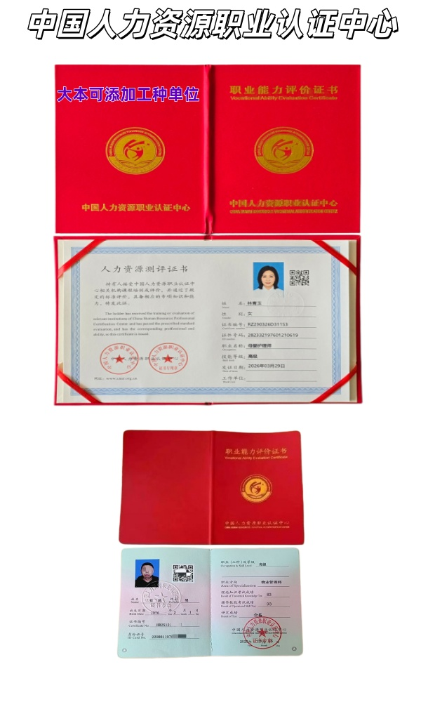中国人力资源职业认证中心是在响应国家分步取消水平评价类技能人员职业资格,推行社会化职业技能等级认定的政策背景下成立的独立法人机构。主要是为各类院校、企业、教育培训机构提供本中心线上的大数据测评题库,协助其开展考评、认证或测评活动,立足社会,服务社会,打造正规化、科学化的社会评价体系,为国内职业人才职业能力测评活动服务。学员经过本中心组织的相关在线考核测评合格后,取得本中心认证的合格证书。通过测评既是优化用人单位选人用人的参考,也是人才职业技能提升的动力。 官网备案,大本+小本双版本 大本可添加工作单位 证书工种:教育,管理,家教,网络,电商,金融,家政,工艺,工程,美业,健康,中医,汽修类等等...全部行业,全部工种可出。 证书等级:初级,中级,高级,一级,二级,三级 查询官网http://www.cnzr.org.cn 工信部备案 报名微信:13313229830 彭老师