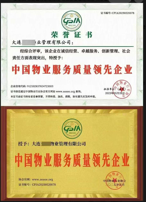 物业行业优质企业、 五星级物业服务企业 、物业行业先行企业、 最佳物业服务供应商、物业行业优秀企业、 AAA级企业信用评价 、物业行业重点单位、 消费者放心产品企业 、物业服务十佳单位、 标准化生产示范基地、物业行业诚信单位、 政府采购优秀供应商 、物业行业优秀服务商、 质量监督抽查合格企业、 物业行业创新典范企业、 数字经济创新案例企业、 物业行业最佳示范企业、 物业行业30强/50强/100强、 物业行业十佳优质企业 、守合同重信用企业AAAA级 、物业行业特色优秀企业、 重合同守信用AAA信用企业 、物业行业百强优秀企业、 AAAAA级劳动保障信用等级、物业行业创新示范企业、 卫生安全质量管理先进单位、物业行业优秀创新企业、 质量·信誉双保障示范单位 、物业行业优秀标杆企业、等等