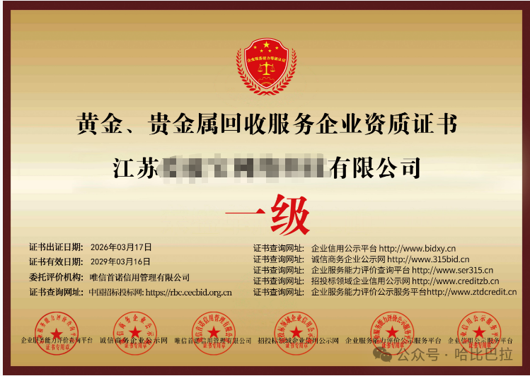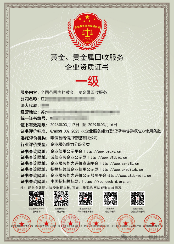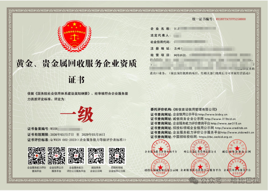 黄金、贵金属回收服务企业资质证书 委托评价机构:唯信首诺信用管理有限公司 行业评价类型:企业服务能力分级分类 证书查询网址: 企业信用公示平台http://www.bidxy.cn 诚信商务企业公示网http://www.315bid.cn 企业服务能力评价查询平台http://www.ser315.cn 招投标领域企业信用公示网http://www.creditzb.cn 企业服务能力评价公示服务平台http://www.ztdcredit.cn 中国招标投标网:https://rbc.cecbid.org.cn 彭老师微信:13313229830